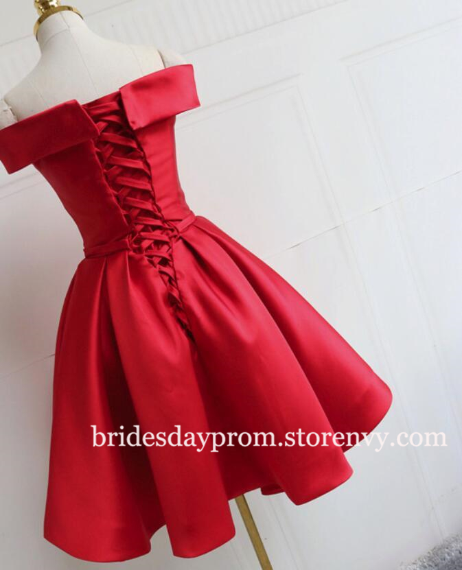 Real Photo Red Off Shoulder Pleated Satin Homecoming Dress, A Line Cocktail, Short Prom party Dress with Belt