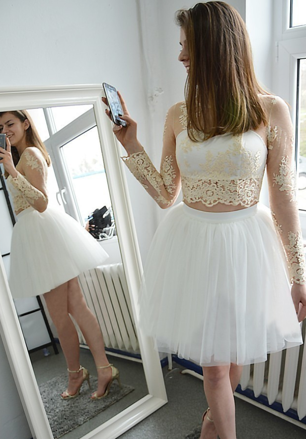 Homecoming Dresses,2 Pieces Lace Prom Dresses Short,Long Sleeves A Line Party Gown