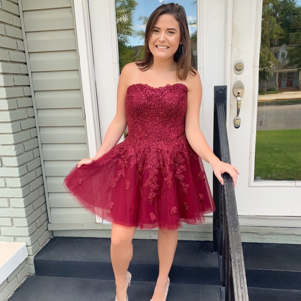 Burgundy Lace Applique Homecoming Dress,V-Neck A-Line Party Dress,Short Lace Prom Dresses