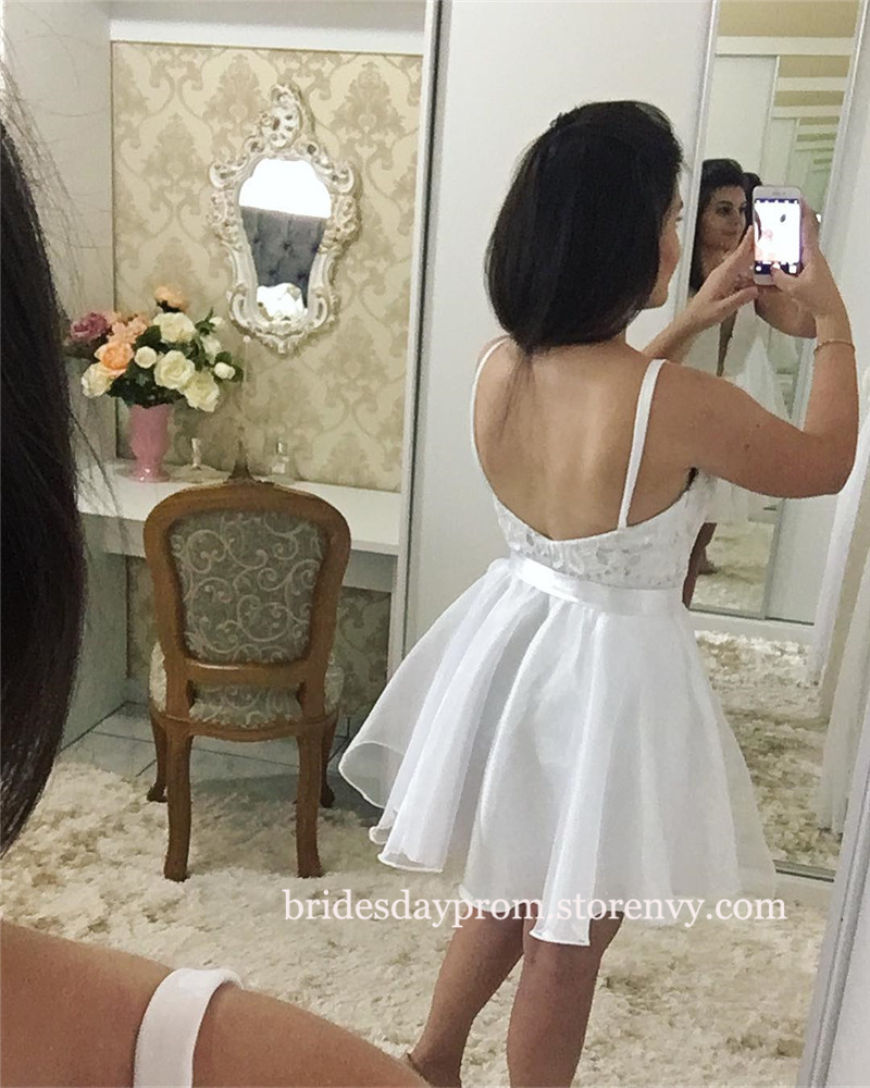 White V Neck Simple Homecoming dresses,Cheap A Line Cocktail Dress with Lace,Hoco Dresses