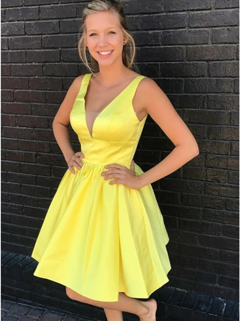 Simple Short Yellow V Neck Cocktail Dresses,V Neck Short Yellow Formal Homecoming Dresses