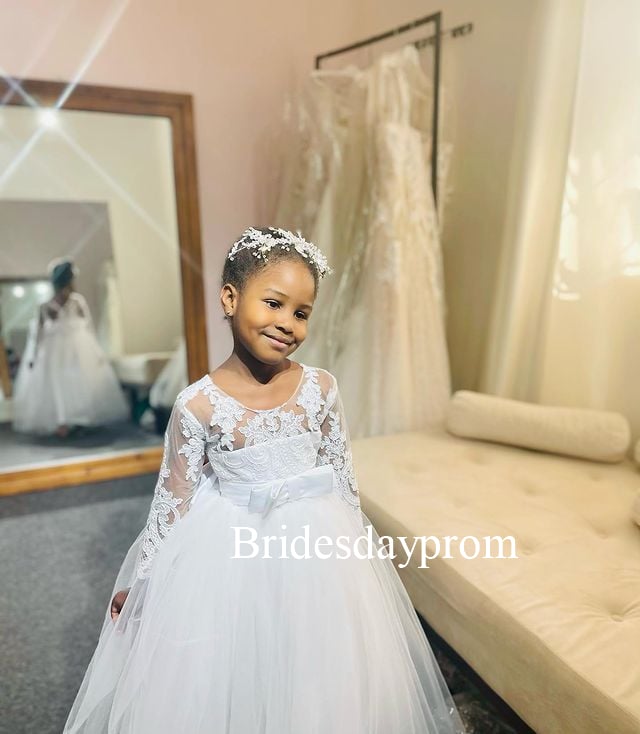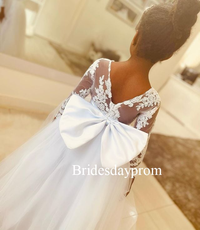 Lace Long Sleeves Ball Gown Flower Girl Dresses,White Pageant Gowns With Big Bow,First Communion Dress for Wedding