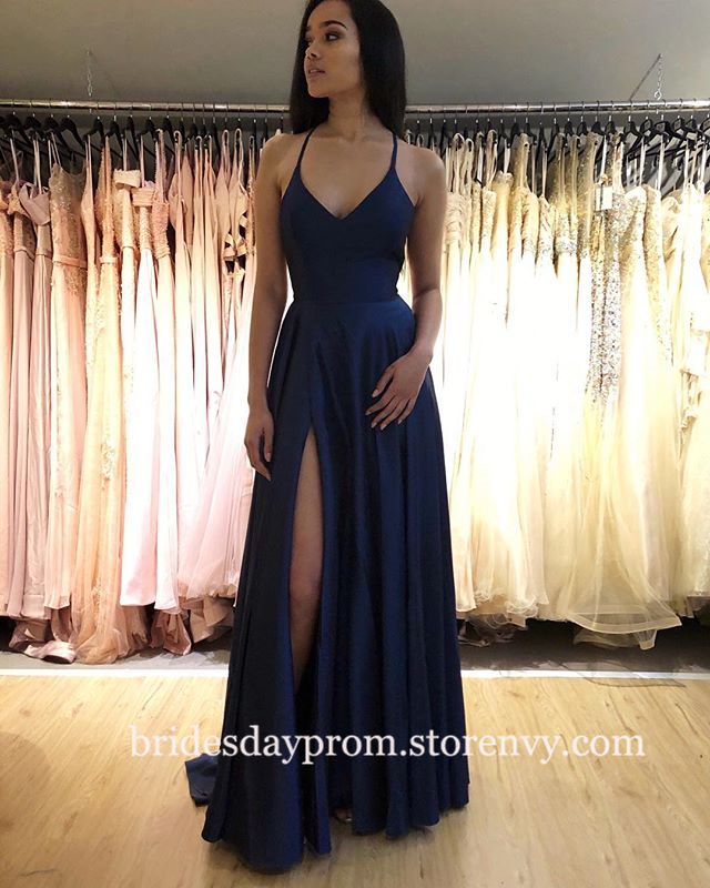 Cheap Navy Blue Prom Dresses Long,V Neck Yellow Back Open Women Formal Dress,Satin Party Gown Simple