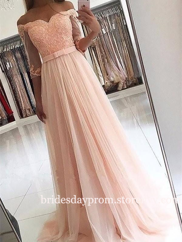 lace off shoulder prom dress,3/4 sleeve prom dress, tulle A Line prom dress,cheap prom dress online, long prom dress, formal evening dress