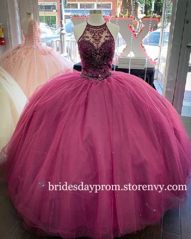 Luxury Crystal Beaded Ball Gown Quinceanera Dress Halter Back Open Pageant Gown Long Tulle Sweet 16 Dresses