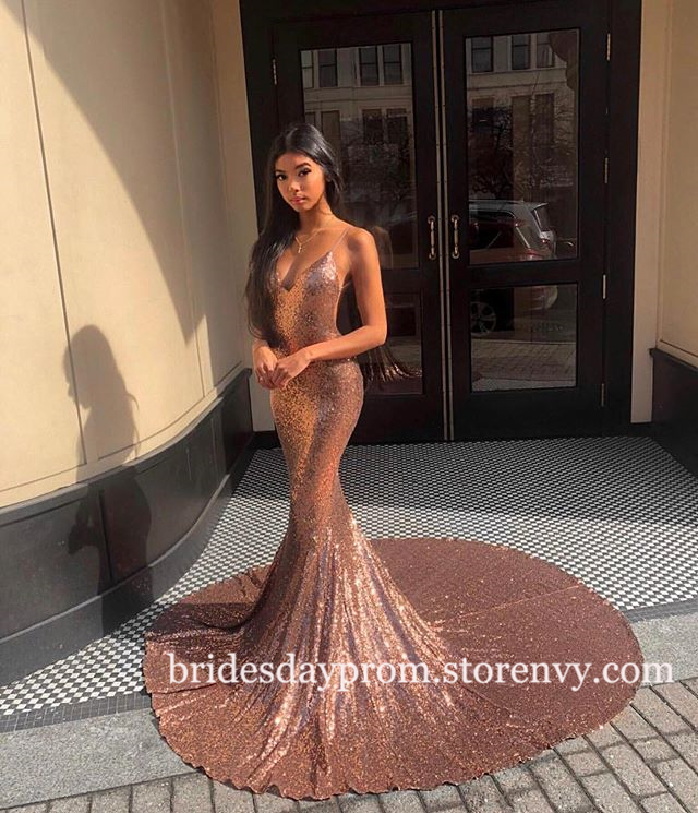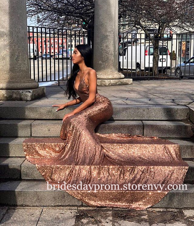 Long Mermaid Sequin Prom Dress,Formal Gowns,V Neck Back Open Evening Dress