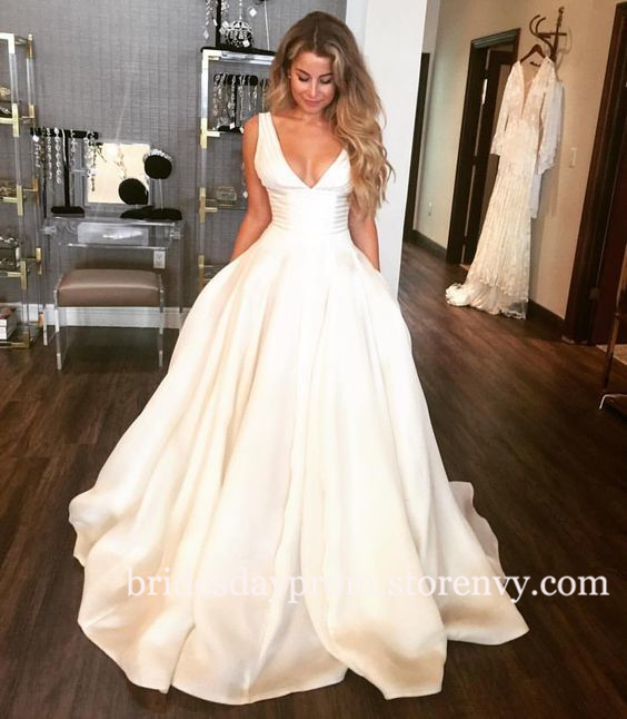 Simple V Neck Backless A Line Wedding Dresses, Satin Bridal Gowns,Sleeveless Wedding Gowns