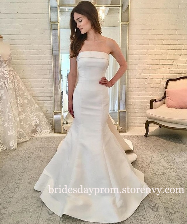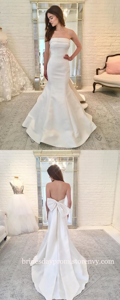 New Strapless Back Open Wedding Gown,Long Plain Satin Simple Beach Bridal Dress,Rustic Bridal Gown with Bow