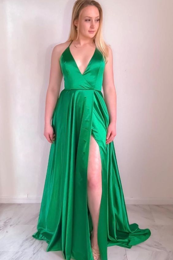 V neck Green Front Slit Evening Dress, Sexy Sleeveless Long Prom Dress,Back Open Formal Party Gown