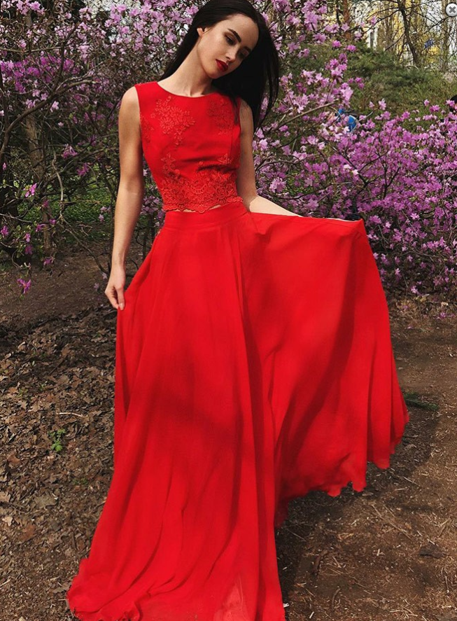 Two Piece Round Neck Red Chiffon Prom Dress with Appliques,A Line Formal Evening dress