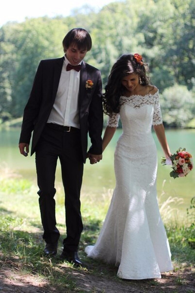 Full Lace Wedding Dresses Mermaid Off Shoulder Half Sleeve Sweep Train Bridal Gowns ,White Cheap Bridal Gown,Custom Made Bride Dress
