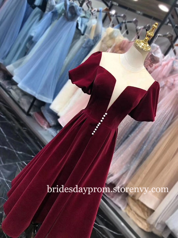 Vintage Short sleeve Burgundy Velvet Prom Dress,O Neck Party Dress,Prom Dresses
