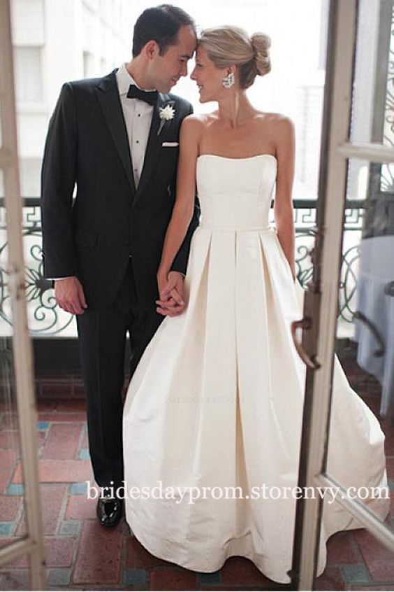 Classic Ivory Satin Wedding Dress,Simple White Strapless Long Bridal Dresses