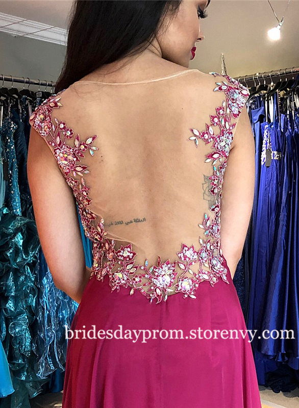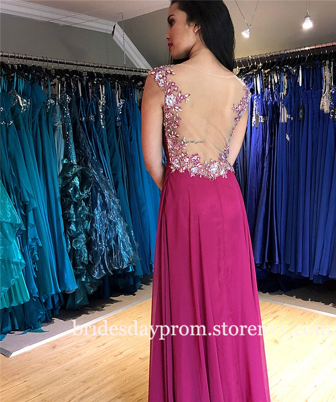Elegant Long Lace Applique Chiffon Prom Dress Sheer Back A Line Formal Evening Dress Cheap
