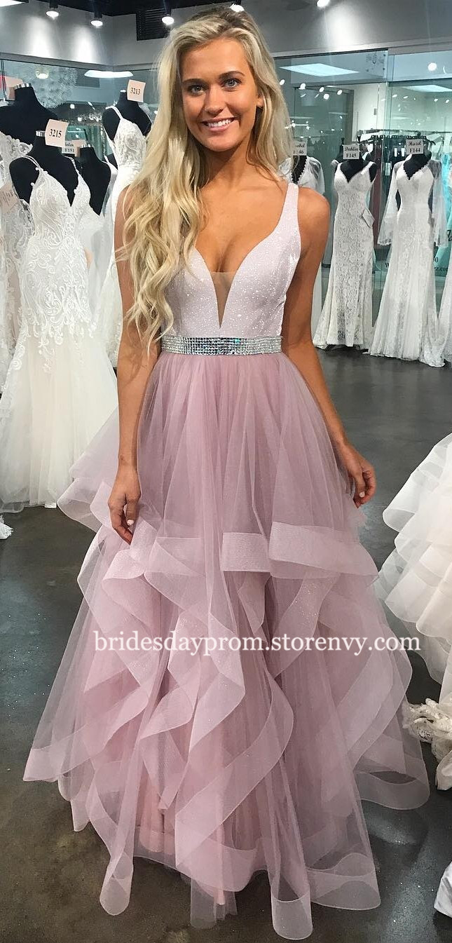 Long Prom Dress with Ruffles,Tulle Formal Dress,Crystal Belt Evening Gown with Back Open