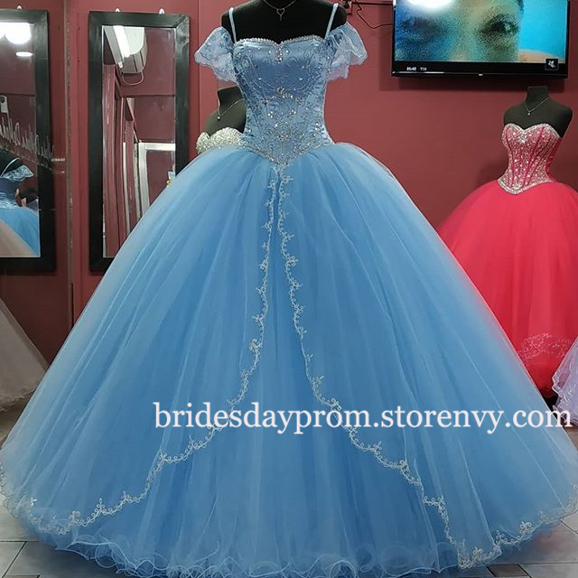 Sky Blue Ball Gown Prom Dress Crystal Beaded Long Tulle Quinceanera Dresses,Formal Dresses