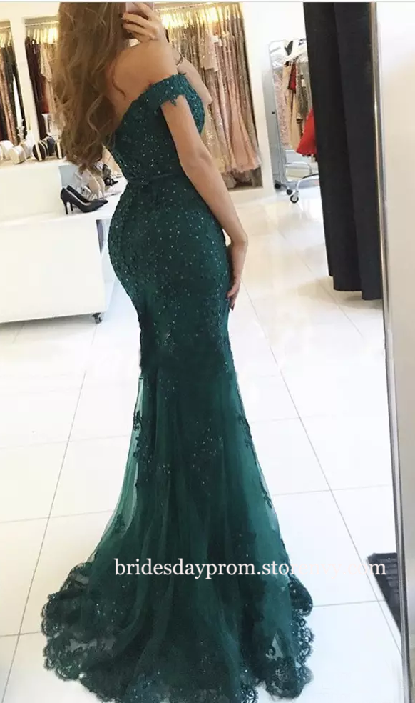 Long Tulle Off Shoulder Backless Prom Dress,Lace Applique Prom Dress, Mermaid Prom Dress,Floor-Length Party Dresses