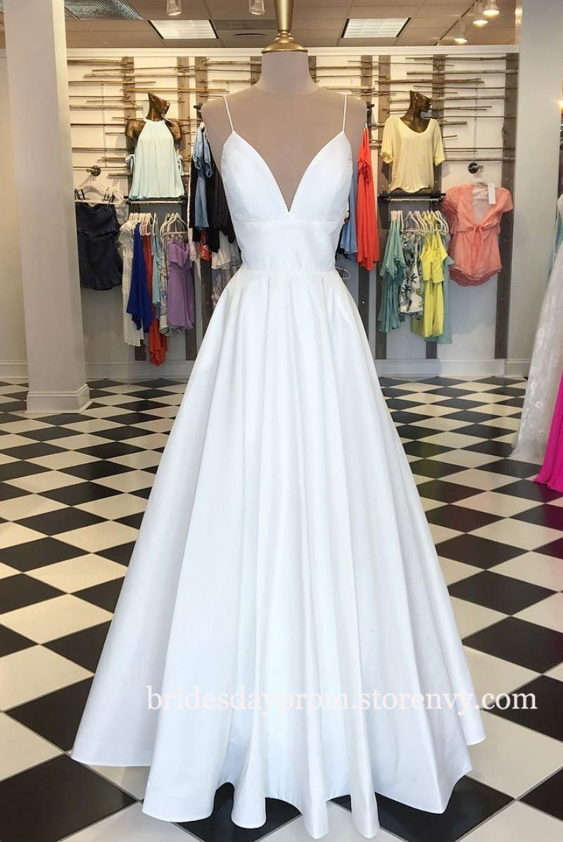 Simple A-Line Spaghetti Straps V Neck Long Prom Dresses,White Satin Formal Party Dresses,Prom Dresses for thick girls
