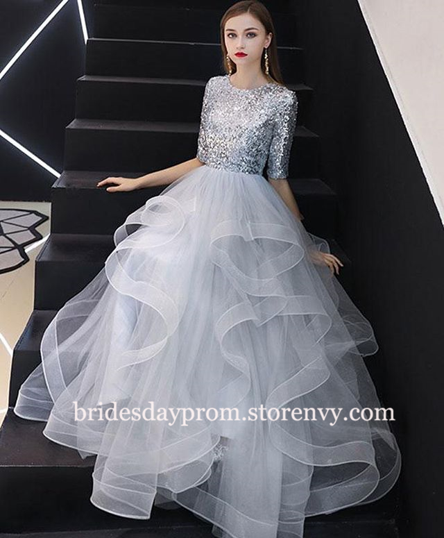 Elegant A Line Long Prom Dresses with 3/4 Sleeve,Ruffles Tulle Evening Dresses, Party Dresses for Women