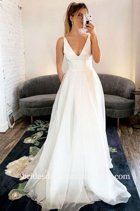 Elegant White v neck wedding dress with pockets,Romantic Back Open Long Women Bridal Gown