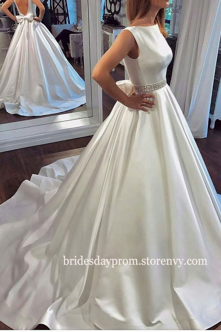 Modest White Wedding Dress with Crystal Belt,Back Open Custom Size Satin Bridal Gowns