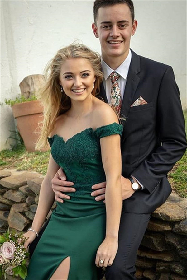 Green Off the Shoulder Mermaid Prom Dresses,Elegant Evening Dresses with Appliques and Side Slit