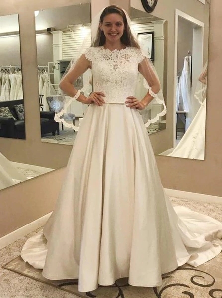 Lace Pockets A-Line Round Neck Satin Wedding Dress,Discount Vintage lace Wedding Gowns