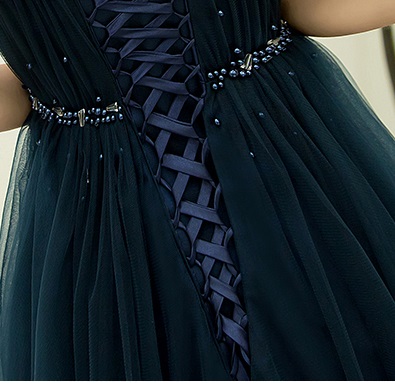 Beautiful Navy Blue Long Prom Dresses with Back Open,Tulle Women Formal Dresses with Pearls