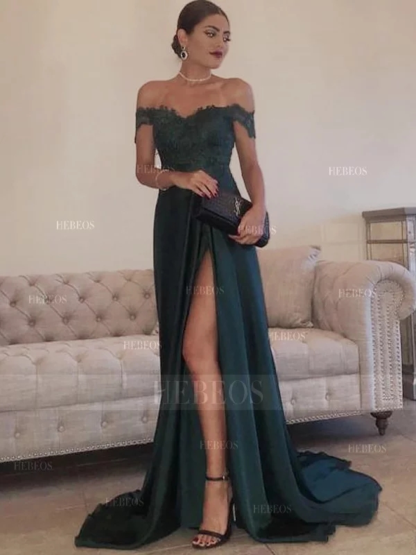Green A-Line Off-the-Shoulder Sleeveless Sweep/Brush Train Prom Party Dresses