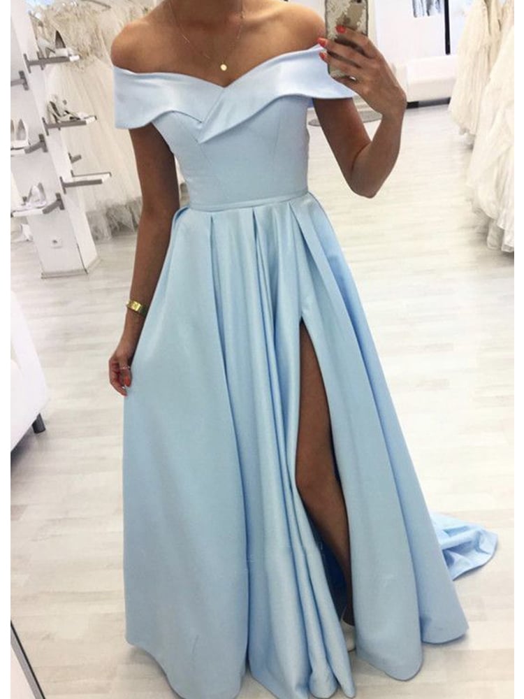 Elegant A Line Off the Shoulder Slit Light Blue Long Prom Dresses, Elegant Evening Dresses