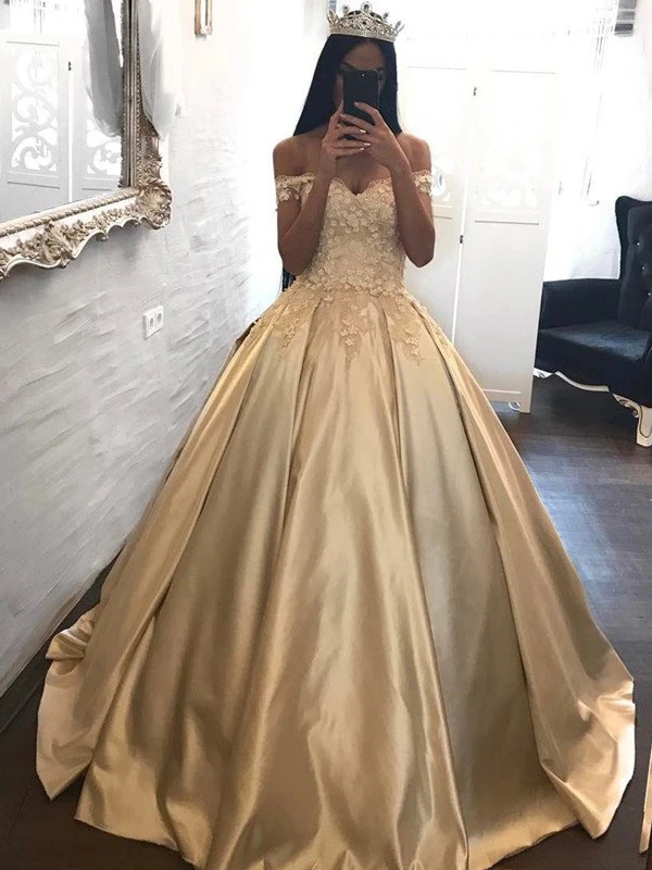 Ball Gown Prom Dresses Off-the-shoulder Appliques Satin Prom Dress,Evening Dress