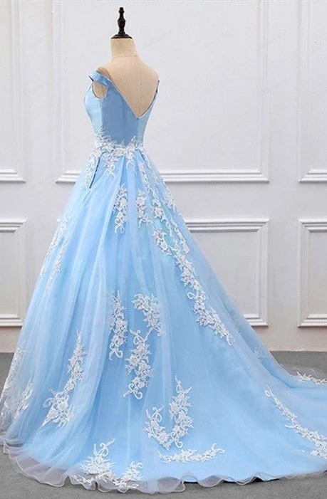 Chic Sky Blue Prom Dresses Off-the-shoulder Sweep/Brush Train Lace Prom Dress/Evening Dress