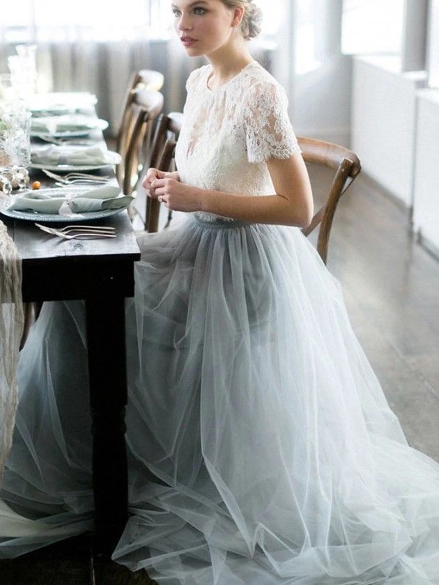 Two Piece Wedding Dresses A-line Sweep Train Lace Simple Tulle Bridal Gown