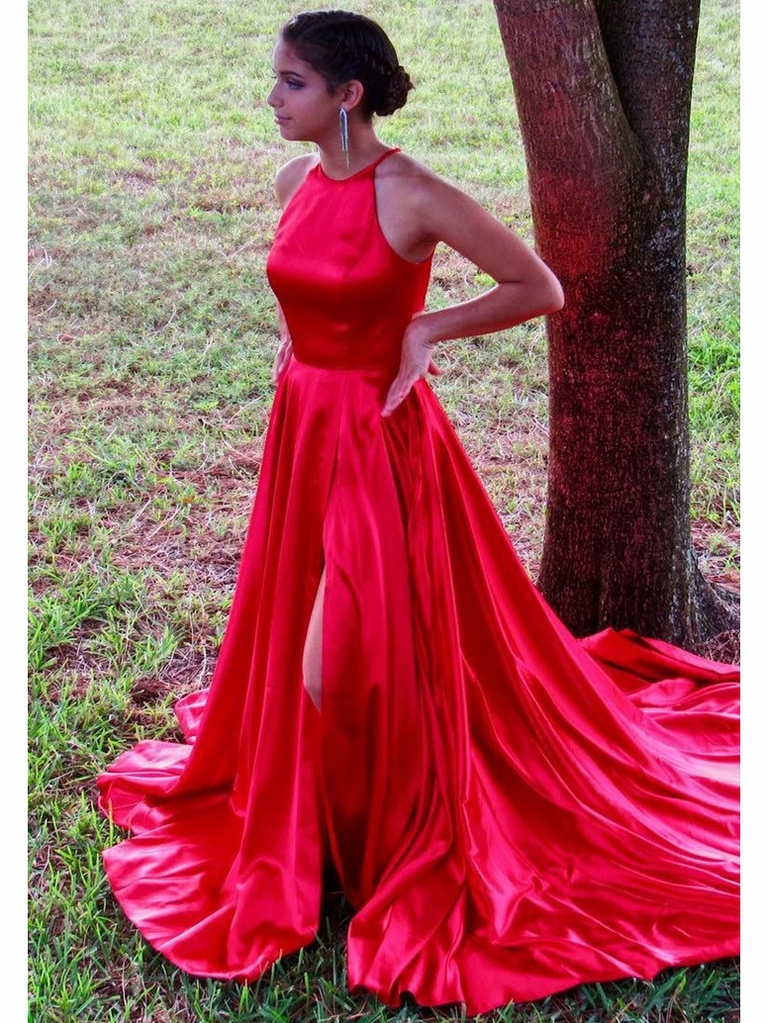 Jewel Neckline Red Satin A-Line Long Prom Dress with Slit