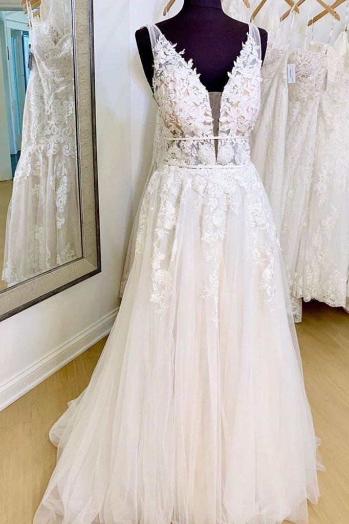 Beautiful wedding dresses lace open back a line,Tulle Bride Dresses with Ribbon Bands