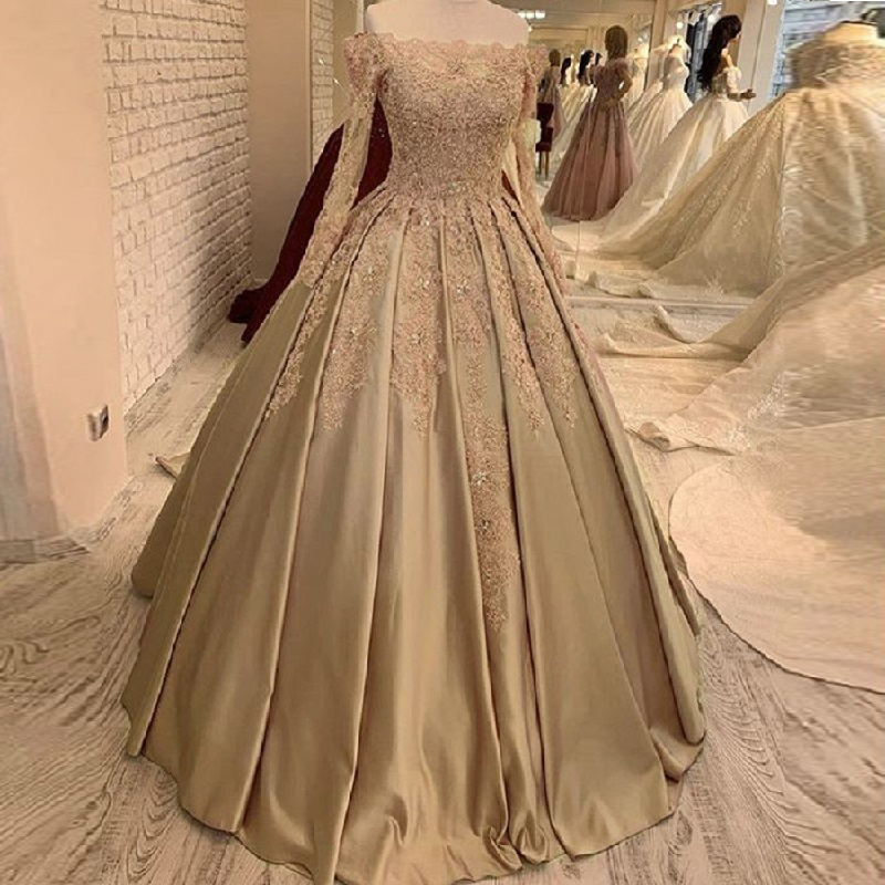 champagne prom dress long lace Ball Gown Corset Satin Party Gown,Back Open Prom Dress