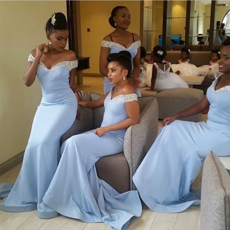 Sky Blue African Bridesmaid Dresses Off Shoulder Long Mermaid Robe De Soiree Sequins Neckline Women Wedding Party Dresses