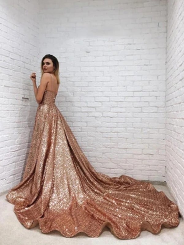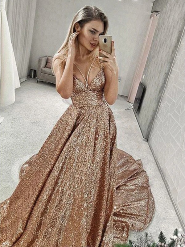 A-Line/Princess Sequins Spaghetti Straps Ruffles Sleeveless Back Open Court Train Prom Dresses