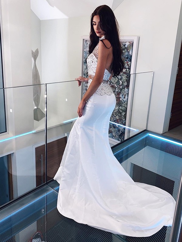 Sparkly Two Pieces Trumpet/Mermaid Satin Beading High Neck Sleeveless Sweep/Brush Train Backless Prom Dresses