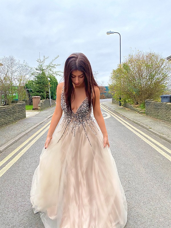 Elegant Crystal Beaded A-Line Tulle V neck Sleeveless Sweep/Brush Train Prom Dresses