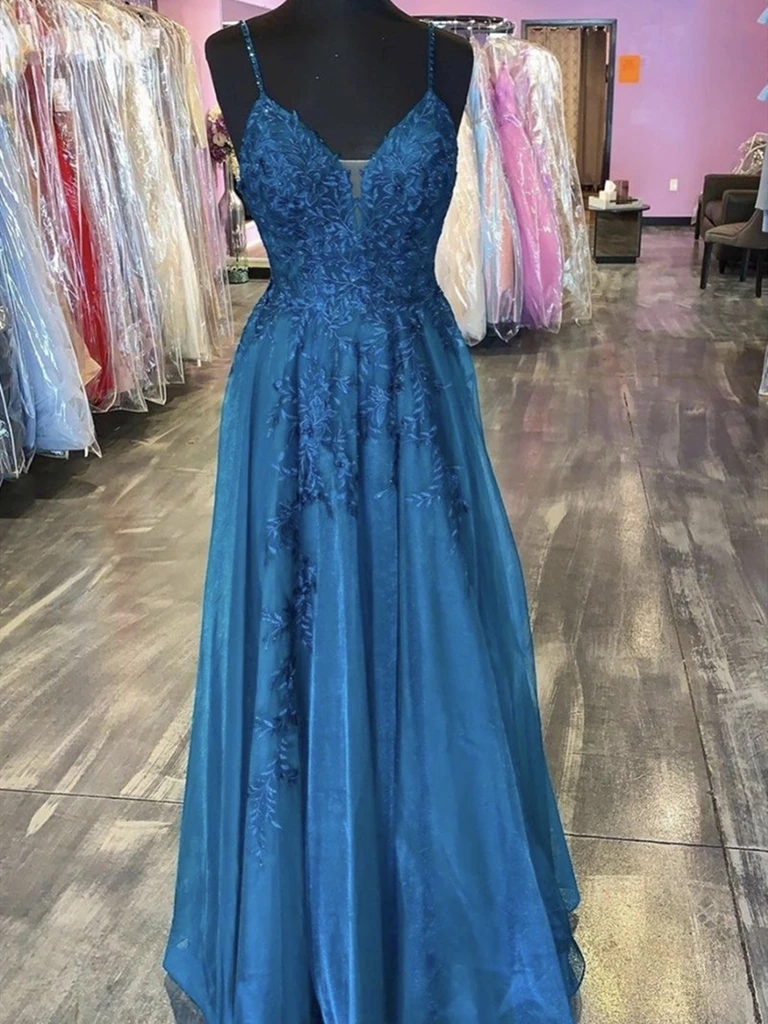 Thin Straps V Neck Long Lace Prom Dresses,V Neck Royal Blue Lace Formal Evening Dresses
