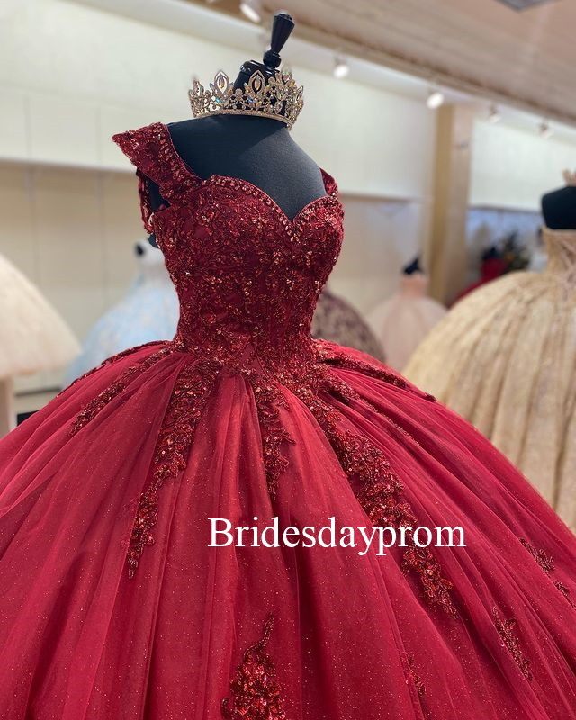 Burgundy Princess Ball Gown Quinceanera Dresses,Lace Beaded V Neck Prom Dress