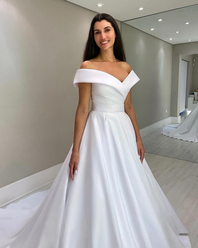 Beautiful White Off Shoulder Wedding Dresses Long,Sleeveless Satin Bride Dress with Train