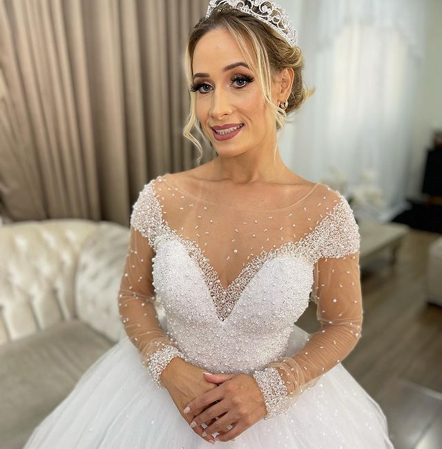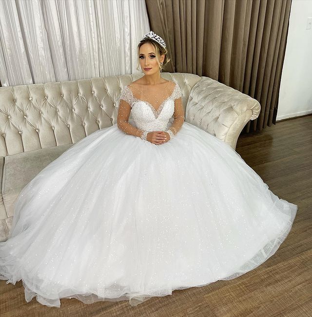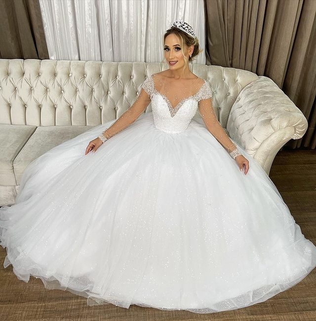 Luxury Beaded Princess Wedding Dress,Western Illusion Long Sleeve White Sparkly Bridal Dress