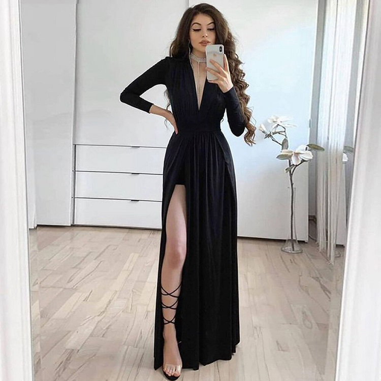 Satin V-neck Long A-Line Evening Dresses Long Sleeves 2022 Formal Party Dress Prom Gowns Slit Maxi Dance Dress