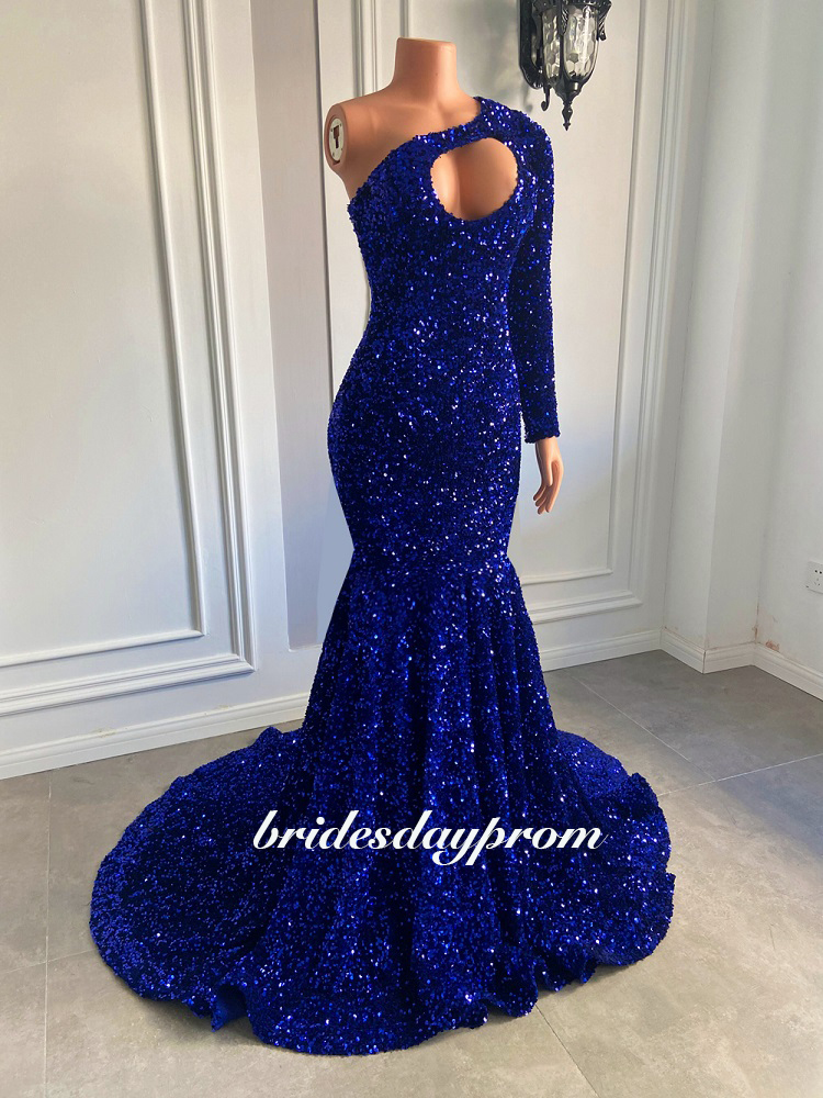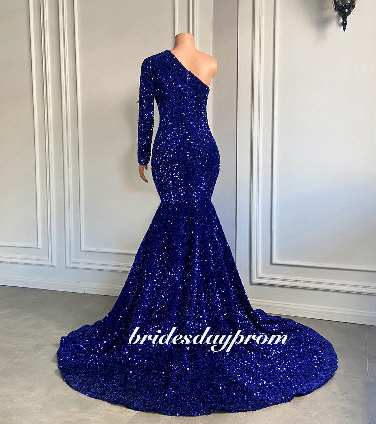 Long Sparkly Prom Dress 2023 One Shoulder Royal Blue Sequin Mermaid Style Black Girls Prom Party Gowns Maxi Dress