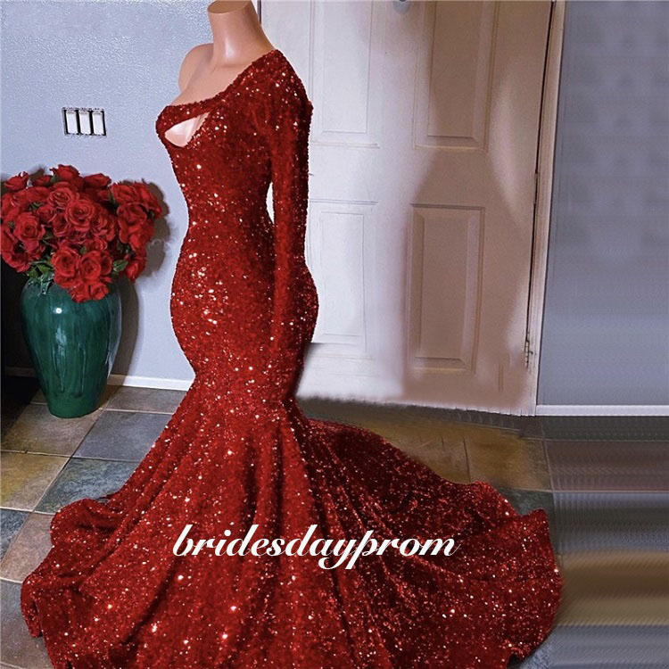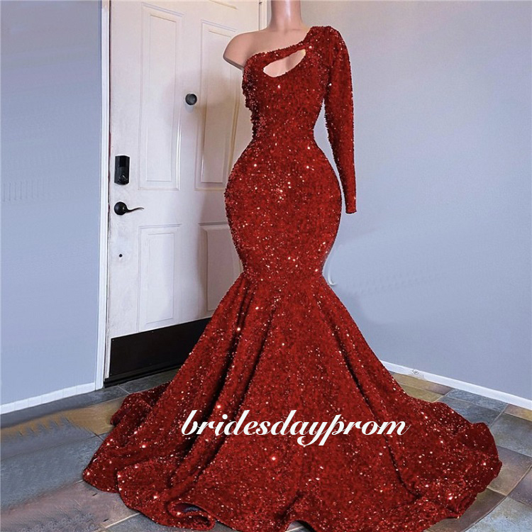 Long Prom Dress Sparkly Glitter Sequin Sexy African Girl Mermaid One Shoulder Red Maxi Dress,Wedding Party Dress