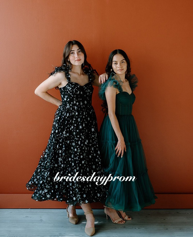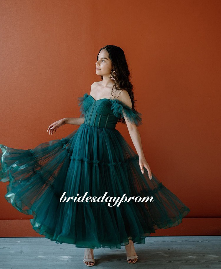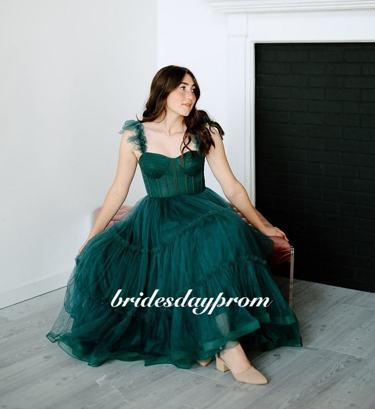 Dark Green Midi Prom Dresses,Spaghetti Straps Tiered Tulle Prom Gowns,Ankle-Length Wedding Party Dress
