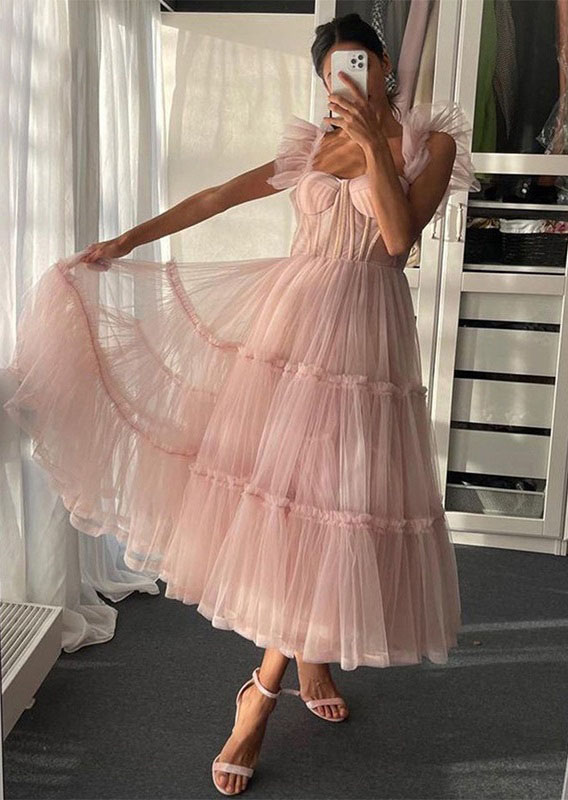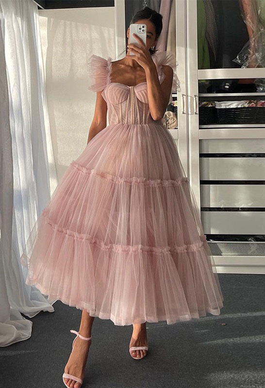 Light Pink Short Prom Dresses Spaghetti Straps Tiered Tulle Tea-Length Wedding Party Dress Evening Wear Graduation