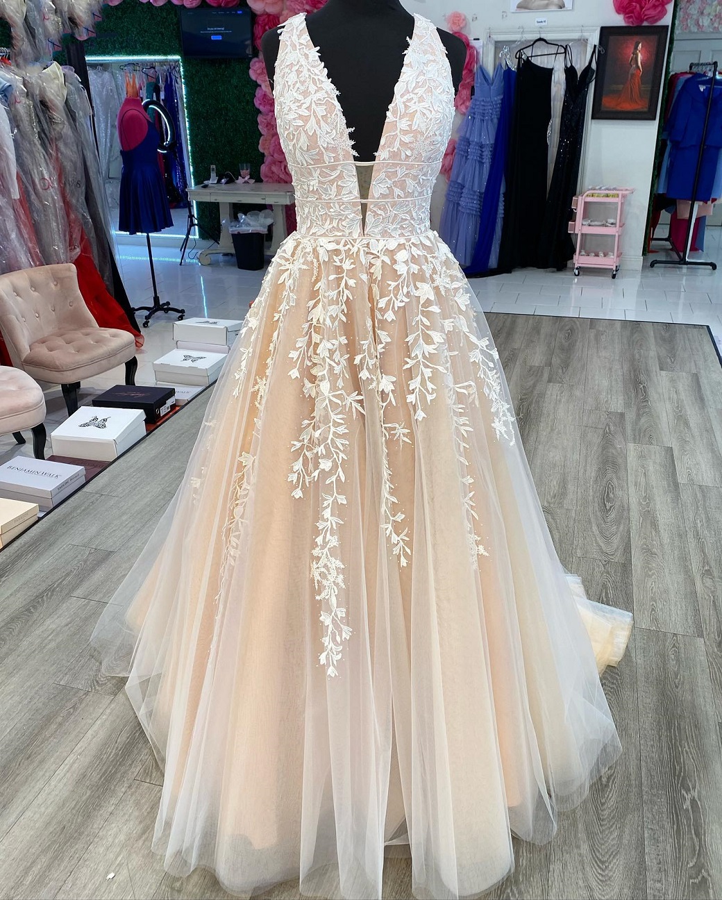 Champagne Lace A-line Plunge Long Formal Dress,Tulle Prom Party Dresses